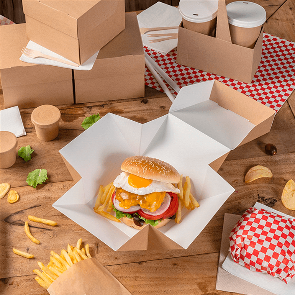 Ideal para restauração. Esta caixa combina funcionalidade com um design ecológico, sendo 100% reciclável e amiga do ambiente.