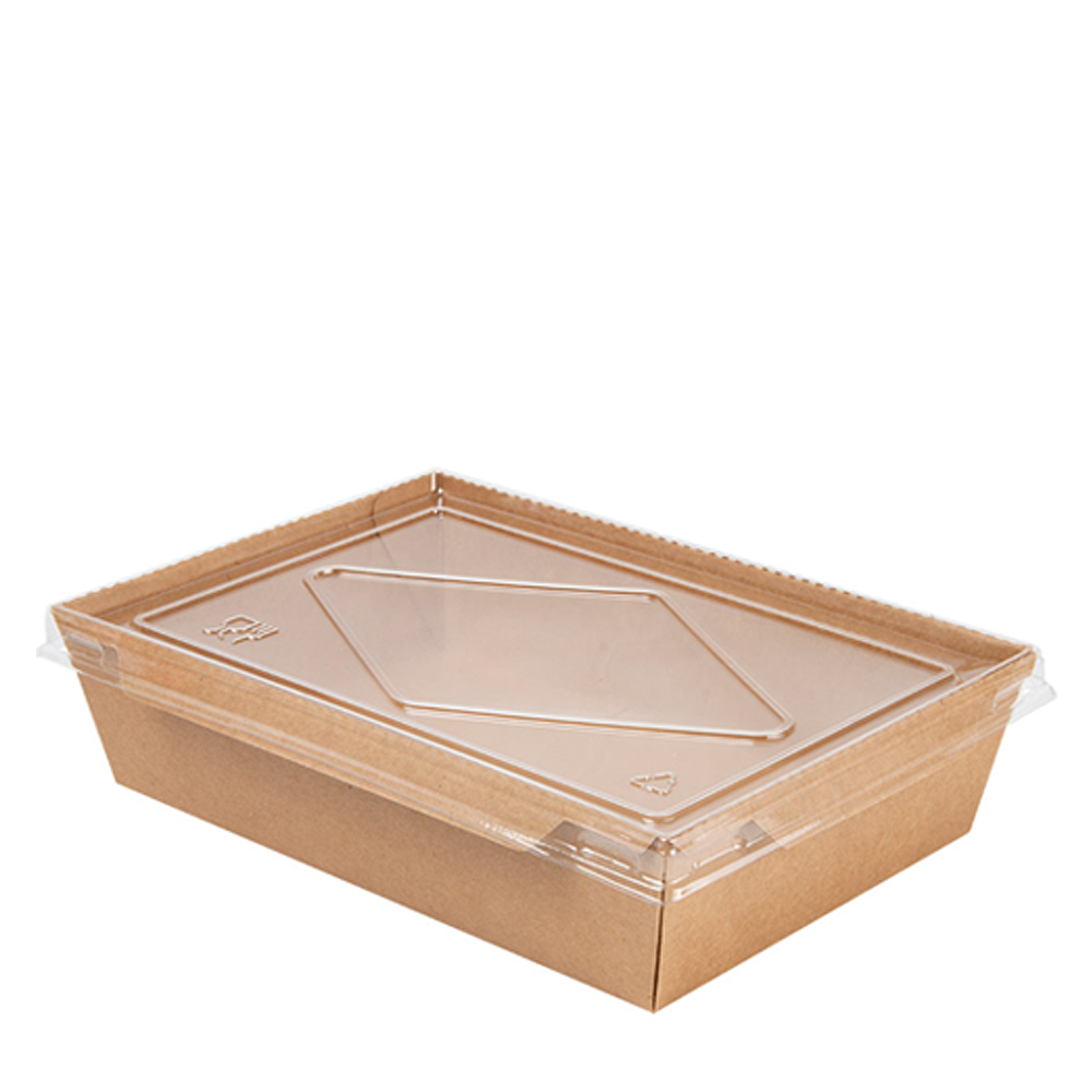 Caixa em Kraft Takeaway com Tampa em PET 19,8×13,8x5CM / 1,2L para uma embalagem eficiente e sustentável que preserva a qualidade e a apresentação dos seus pratos durante o transporte.