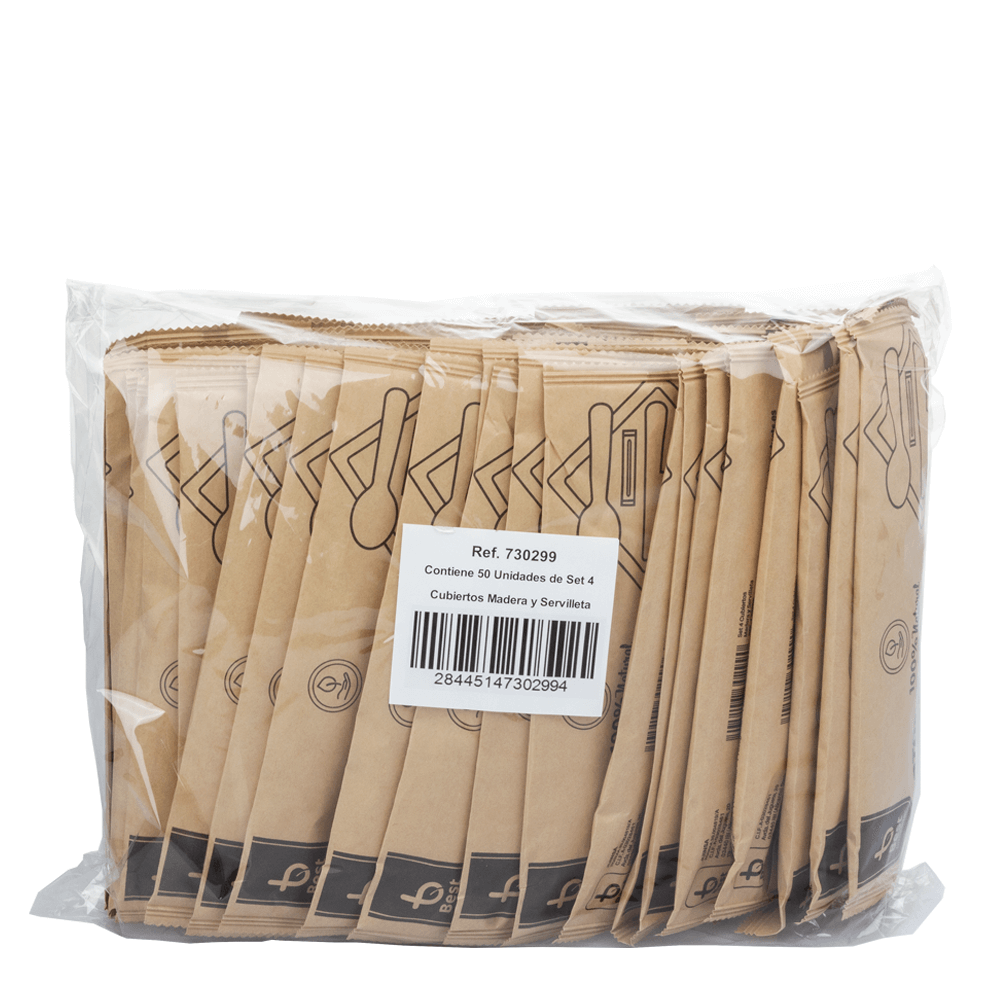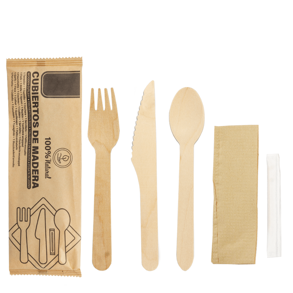 Cada conjunto Garfo + Faca + Colher + Palito em Madeira e guardanapo é embalado individualmente em papel resistente, o que protege contra contaminações externas e facilita a logística em serviços de takeaway. Esta embalagem garante confiança ao consumidor e ao mesmo tempo mantém a pegada ecológica reduzida.