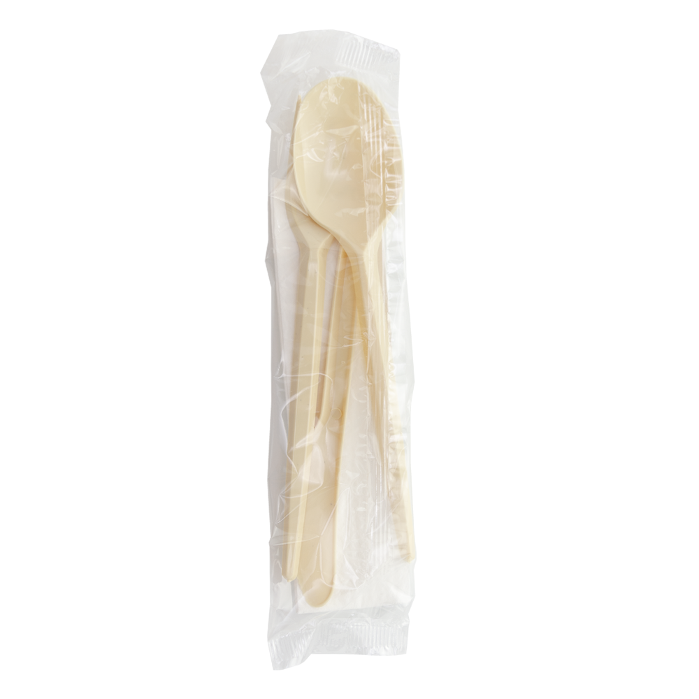 Composição: garfo, faca e colher de sopa em PS REUSE + guardanapo. Acondicionamento: embalagem individual transparente. Utilização: restauração, take-away, catering, eventos e consumo em viagem. Características: reutilizável, resistente, higiénico, leve e de fácil transporte. Indicação: próprio para contacto alimentar.