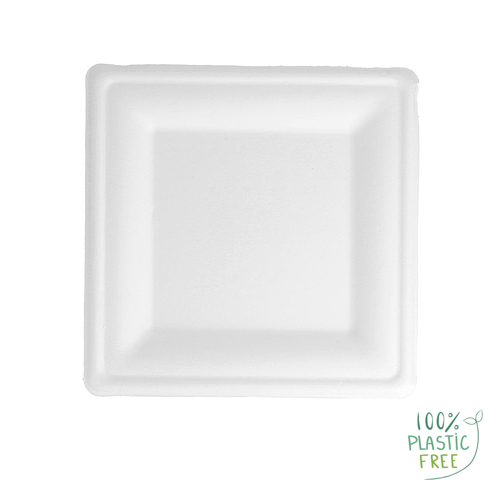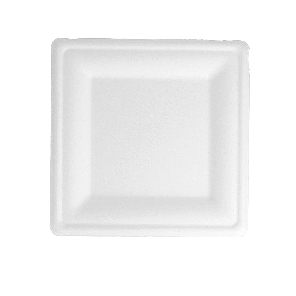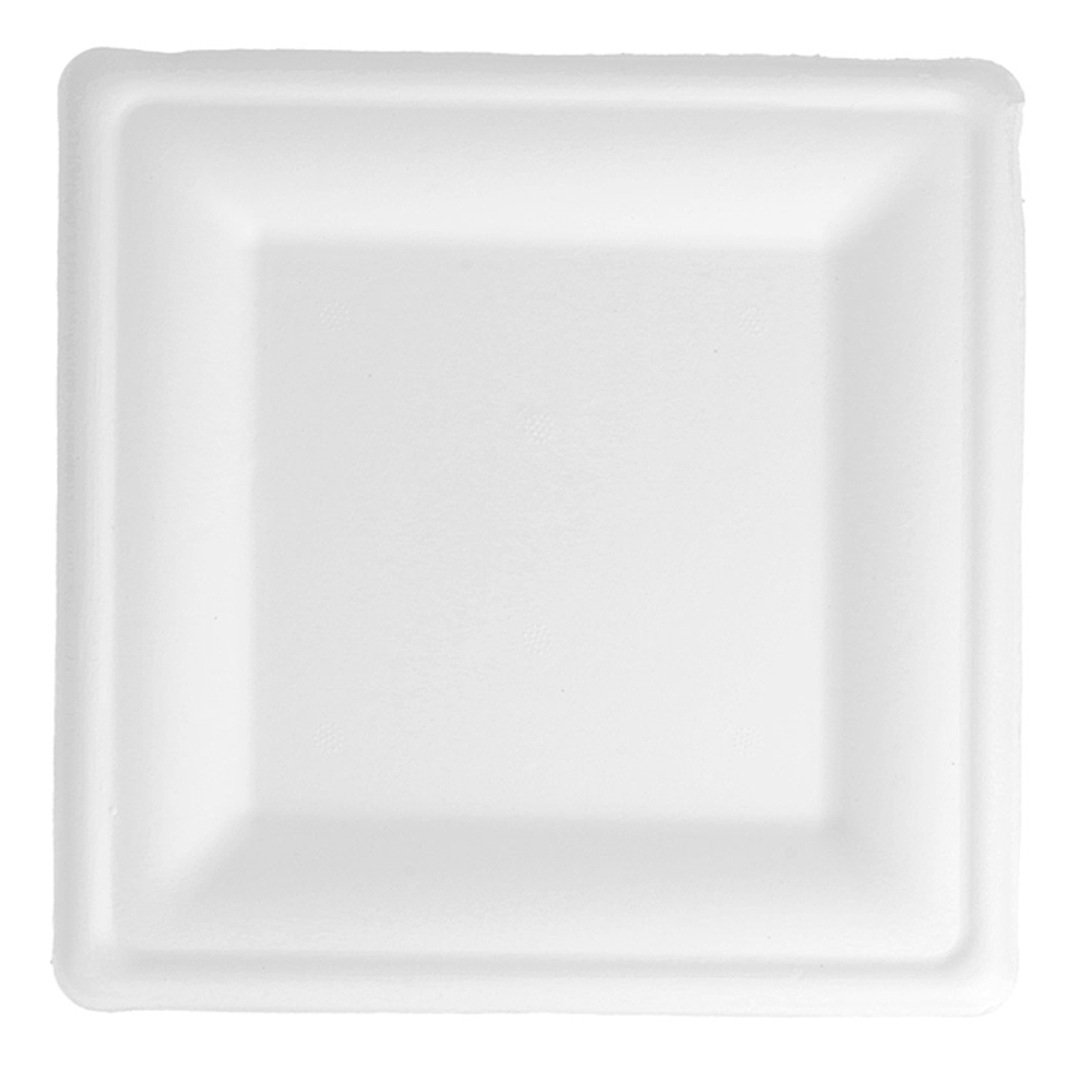 Dimensão: 20 cm (quadrado). Cor: branco. Material: bagaço de cana-de-açúcar. Tipo: descartável, biodegradável e compostável EN 13432. Propriedades: resistente a óleos e humidade; apto para contacto alimentar; intervalo de utilização aproximado −18 ºC a +100 ºC; apto para micro-ondas (curta duração); não apto para forno.