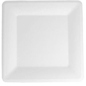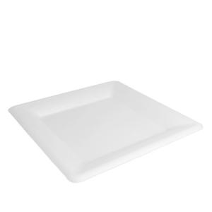 Dimensão: 26 cm (quadrado). Cor: branco. Material: bagaço de cana-de-açúcar. Tipo: descartável, biodegradável e compostável EN 13432. Propriedades: resistente a óleos e humidade; apto para contacto alimentar; intervalo de utilização aproximado −18 ºC a +100 ºC; apto para micro-ondas (curta duração); não apto para forno.