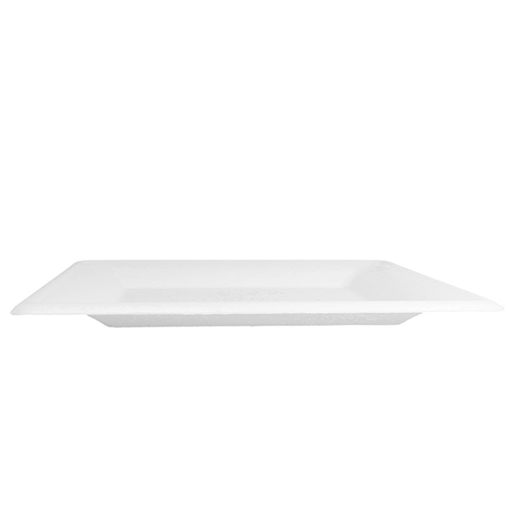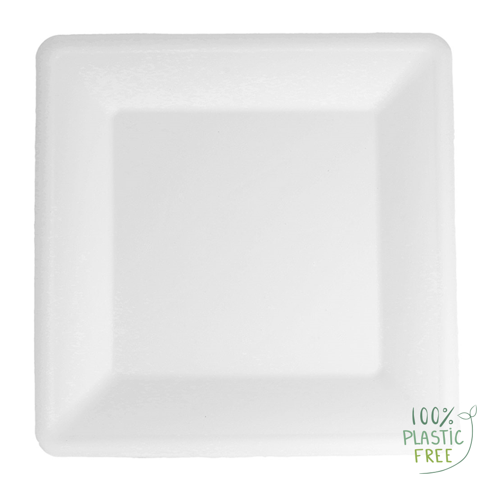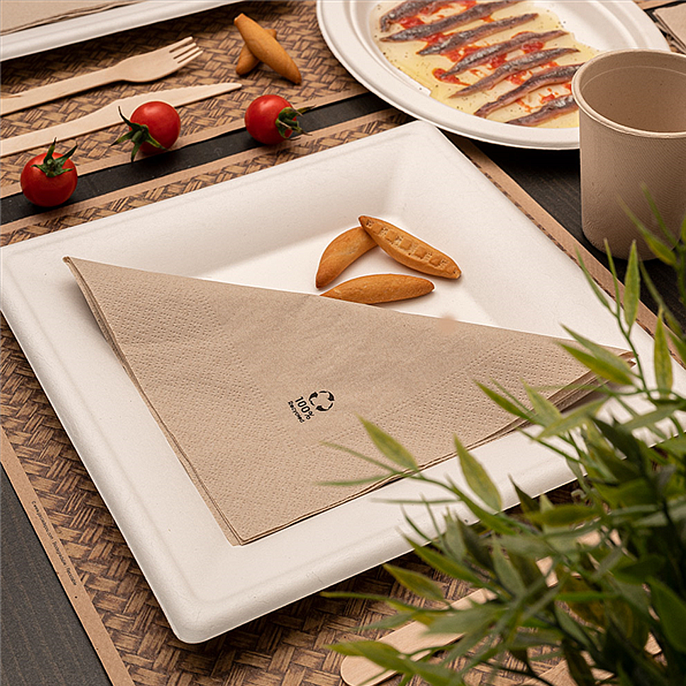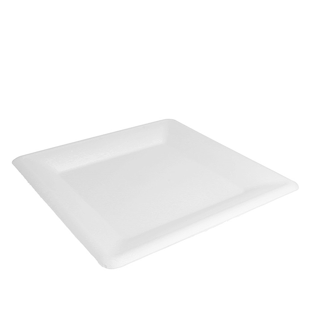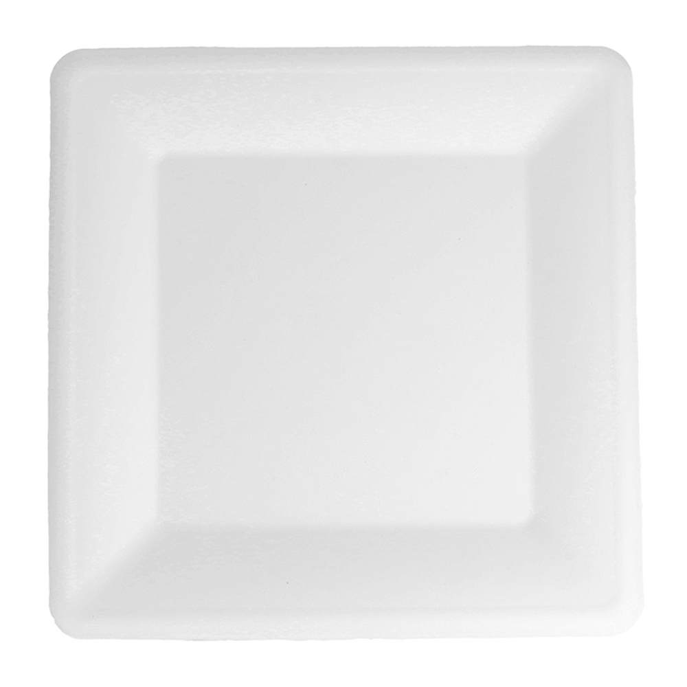 Dimensão: 26 cm (quadrado). Cor: branco. Material: bagaço de cana-de-açúcar. Tipo: descartável, biodegradável e compostável EN 13432. Propriedades: resistente a óleos e humidade; apto para contacto alimentar; intervalo de utilização aproximado −18 ºC a +100 ºC; apto para micro-ondas (curta duração); não apto para forno.