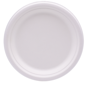 Diâmetro: 22 cm. Cor: branco. Material: fibra de cana-de-açúcar (bagasse). Tipo: descartável, biodegradável e compostável EN 13432. Propriedades: resistente a óleos e humidade; apto para contacto alimentar; intervalo de utilização aproximado −18 ºC a +100 ºC; apto para micro-ondas (curta duração); não apto para forno.