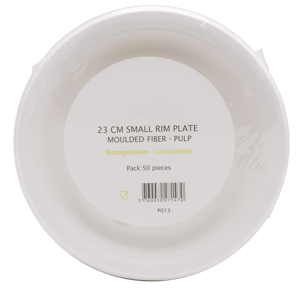 Diâmetro: 22 cm. Cor: branco. Material: fibra de cana-de-açúcar (bagasse). Tipo: descartável, biodegradável e compostável EN 13432. Propriedades: resistente a óleos e humidade; apto para contacto alimentar; intervalo de utilização aproximado −18 ºC a +100 ºC; apto para micro-ondas (curta duração); não apto para forno.