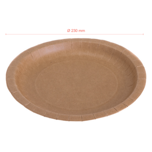 Diâmetro: 23 cm. Cor: kraft natural. Material: papel/cartão kraft de fibras virgens. Tipo: descartável, reciclável. Propriedades: resistente a óleos e humidade; apto para contacto alimentar; adequado a quentes e frios; apto para micro-ondas (curta duração); não apto para forno.