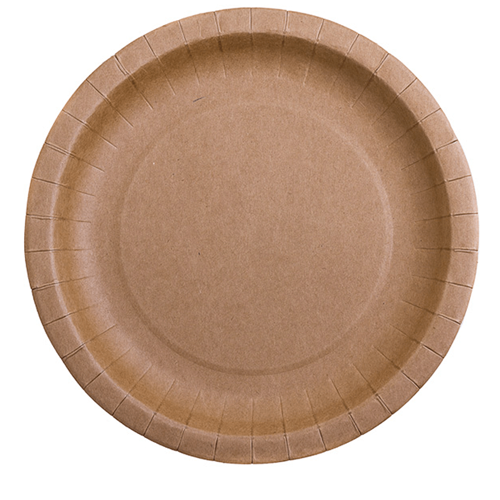 Diâmetro: 23 cm. Cor: kraft natural. Material: papel/cartão kraft de fibras virgens. Tipo: descartável, reciclável. Propriedades: resistente a óleos e humidade; apto para contacto alimentar; adequado a quentes e frios; apto para micro-ondas (curta duração); não apto para forno.