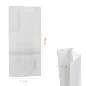 Com 25 cm de altura, 11 cm de comprimento e 5 cm de largura, o formato alto e estreito mantém o conteúdo estável. Assim, o saco transporte branco acomoda pão pequeno, bolos acondicionados, snacks, fruta miúda, especiarias, lembranças, cosméticos leves e diversos acessórios. Como resultado, a apresentação mantém-se cuidada até à entrega.